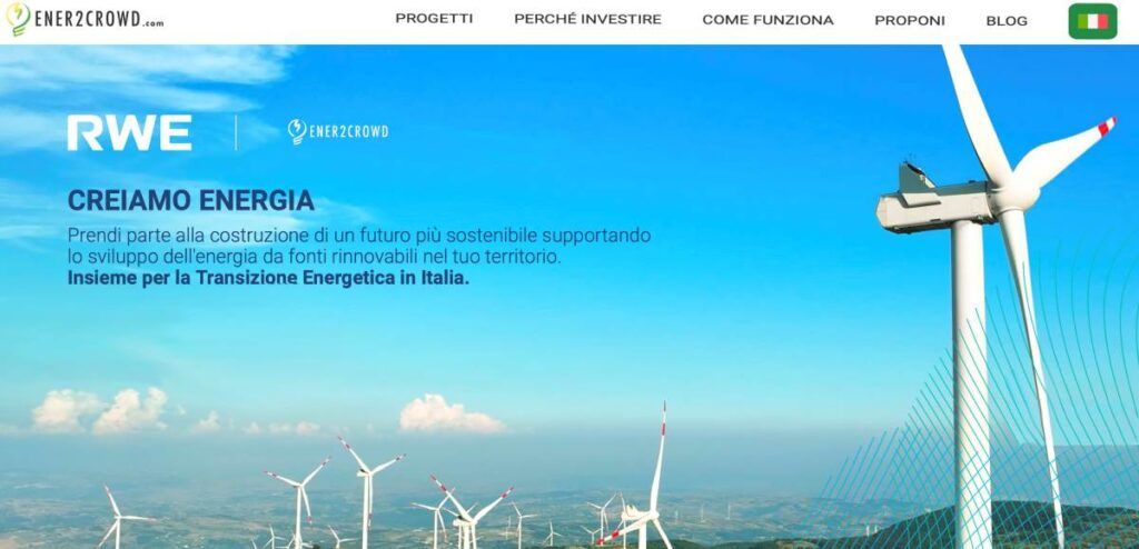 Per la sua espansione nel nostro Paese attraverso la finanza etica partecipativa, RWEha sceltoEner2Crowd.com, la piattaforma ed app per gli investimenti sostenibili tra le prime in Italia autorizzate da CONSOB. Attiva sul mercato da 4 anni, Ener2Crowd.com ha già finanziato oltre 110 progetti ESG per oltre 23 milioni di euro di raccolta con oltre 12 mila iscritti ed oltre 20 mila investimenti sottoscritti.