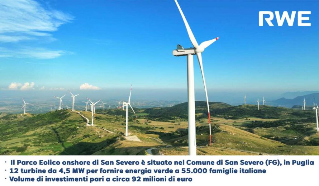 RWE ha già avviato la costruzione del Parco Eolico di San Severo. Si prevede che il parco, con una capacità installata di 54 MW prodotta da 12 turbine da 4,5 MW ciascuna, verrà portato a termine entro la fine del 2024.
